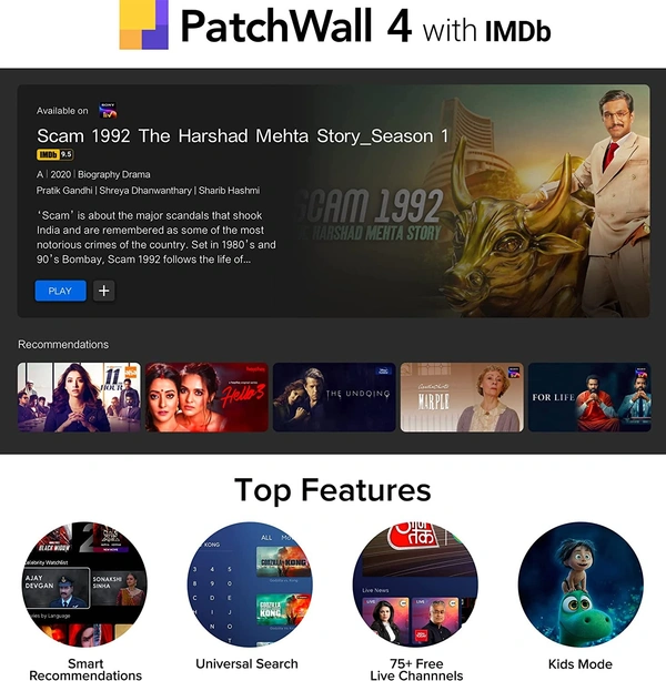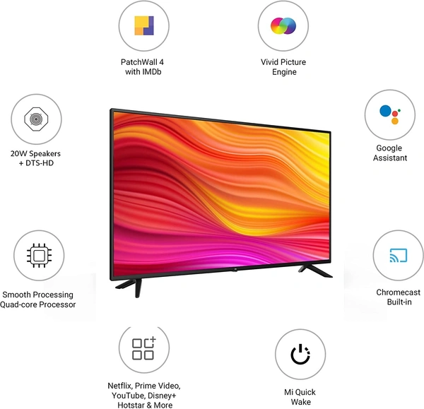 - Smart TV Features : Android TV 9 | Chromecast built-in | PatchWall 4 with IMDb integration | 75+ Free Live Channels | Universal search | Language Universe (16+ Languages) | Miracast | Supported Apps: Prime Video | Netflix, Disney + Hotstar, YouTube, Apple TV, 5000+ apps from Play Store | Quad core processor | Built-in Wi-Fi | 1GB RAM + 8GB Storage